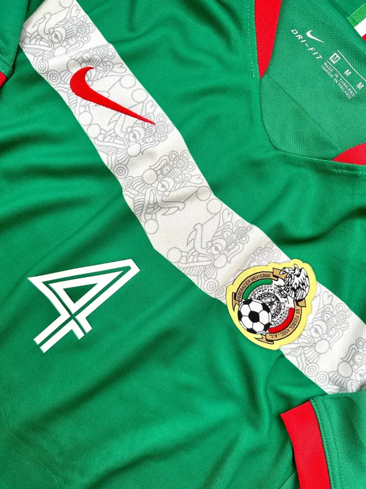 El icónico jersey de la “Piedra del Sol”, diseñado por ABA Sport, se convirtió en uno de los más recordados. Su estampado se inspiró en la piedra del sol mexica (mal llamada “Calendario Azteca”), con tonos verdes y detalles prehispánicos.