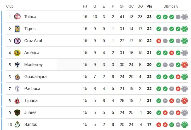 El Toluca se mantiene como líder general del torneo y apunta como el máximo favorito para conquistar el título. Muy cerca están Tigres y Cruz Azul, que han tenido un desempeño sólido a lo largo de la competencia.