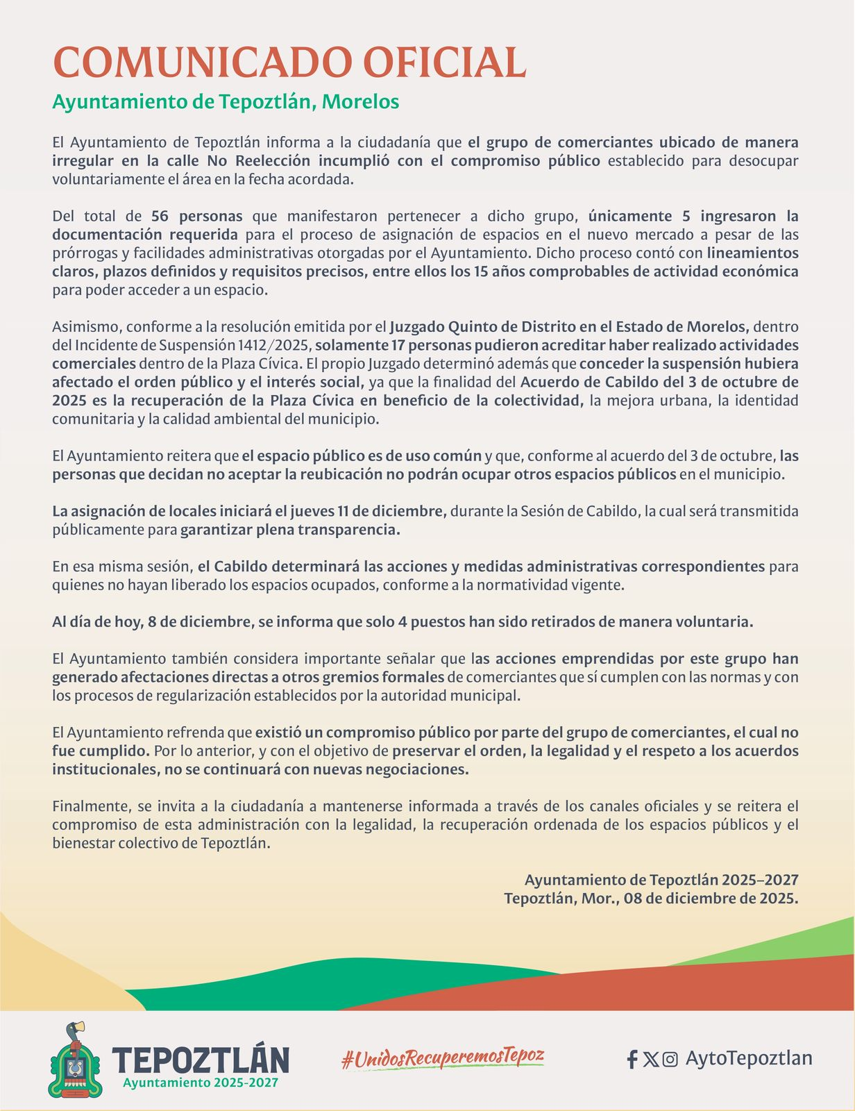 El jueves 11 de diciembre se realizará una Sesión de Cabildo, transmitida en redes sociales, para transparentar la asignación de locales y definir las acciones administrativas para los comerciantes que se han negado a cumplir el acuerdo del 3 de octubre, publicado en el Periódico Oficial del Estado.