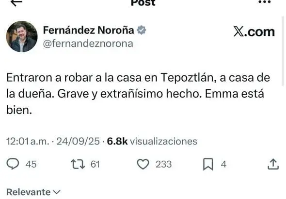 En su publicación, Noroña aseguró que “Emma está bien”, en referencia a su pareja, Emma Ocampo, sin especificar si ella estuvo en la casa al momento del robo.