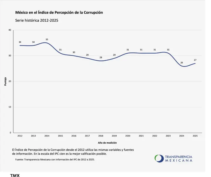 México se ubicó en el puesto 141 de 182 países evaluados en el Índice de Percepción de la Corrupción (IPC) 2025 que publicó este martes la organización Transparencia Internacional, con una calificación de 27 puntos sobre 100 posibles.