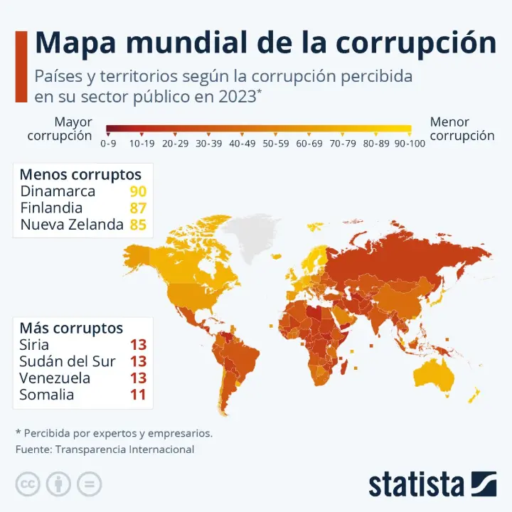 A nivel mundial, los países con mejores resultados en el IPC 2025 fueron Dinamarca, Finlandia y Singapur, mientras que naciones con altos niveles de percepción de corrupción incluyen a Sudán del Sur, Somalia y Venezuela.