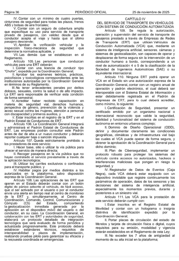 El Capítulo IV, que comprende los artículos 109 al 114, obliga a las ERT a obtener autorización oficial y demostrar que sus unidades son seguras. Para ello deberán presentar certificaciones internacionales, definir las condiciones de operación de cada vehículo, implementar protocolos de ciberseguridad y equipar las unidades con una “caja negra”. Además, los autos deberán estar registrados en el estado, portar placas de Morelos, tener menos de siete años de antigüedad y cumplir con medidas mínimas de seguridad.