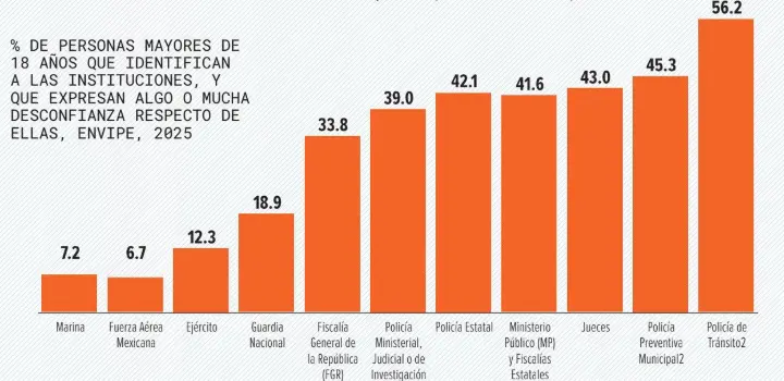 En contraste, las fuerzas armadas son las instituciones mejor evaluadas. La Marina Armada de México encabeza la lista con solo 7.8% de desconfianza, seguida por la Fuerza Aérea Mexicana (6.7%), el Ejército Mexicano (12.3%) y la Guardia Nacional (18.9%).