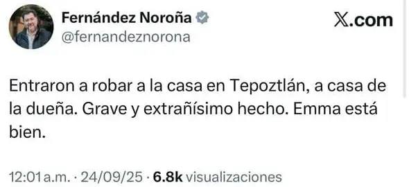 Durante la madrugada, el senador Gerardo Fernández Noroña denunció el hecho a través de su cuenta en la red social X, donde señaló que se trató de un robo a la casa de su vecina, calificando el incidente como “grave y extrañísimo”.