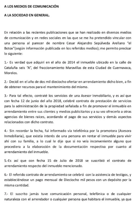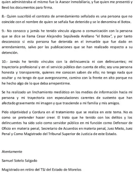 En una carta dirigida a los medios, firmada como magistrado en retiro del Tribunal Superior de Justicia de Morelos (TSJ), se refirió a las publicaciones que señalaban que “El Botox”, presunto líder del grupo “Los Viagras”, fue detenido en 2018 en una casa de su propiedad en el fraccionamiento Maravillas, en Cuernavaca.