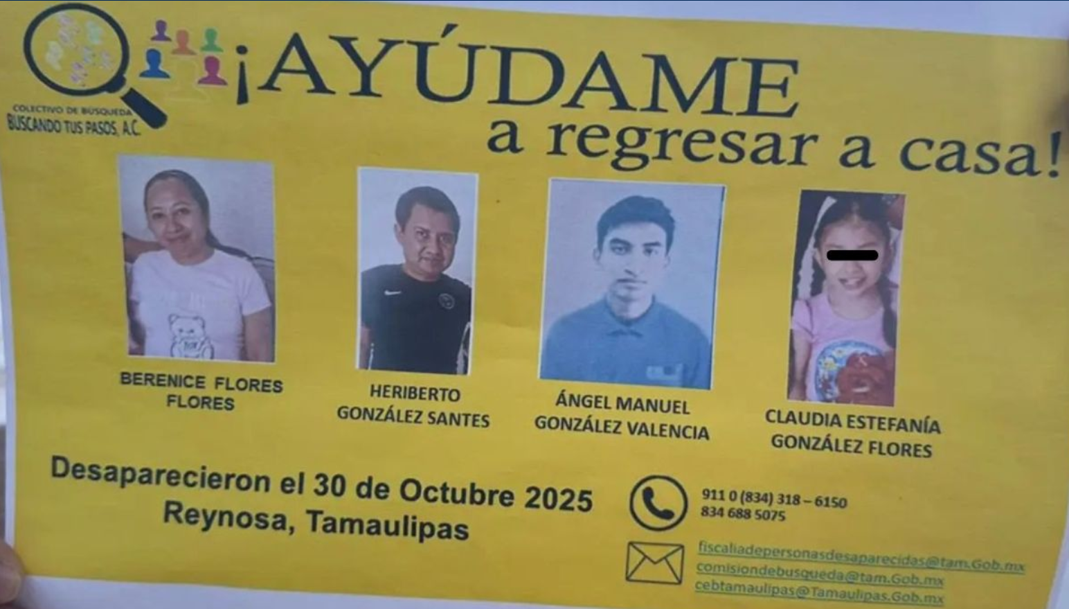 El 5 de noviembre, las autoridades localizaron los cuerpos de los tres adultos en un camino de terracería a las afueras de Reynosa. Horas más tarde, tras el cumplimiento de una orden de cateo, fue encontrado el cuerpo de la menor Claudia Estefanía González Flores, de 10 años, en un inmueble del fraccionamiento Valle Soleado.